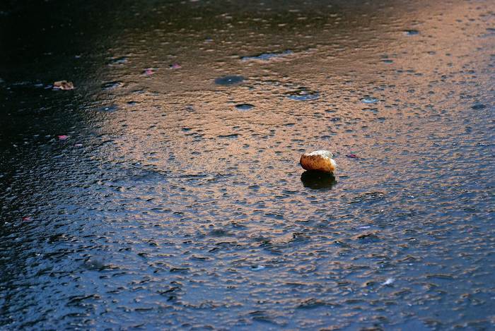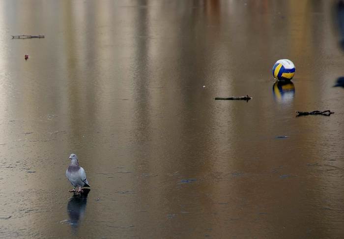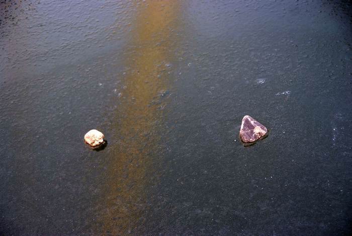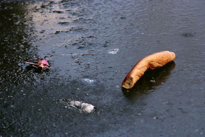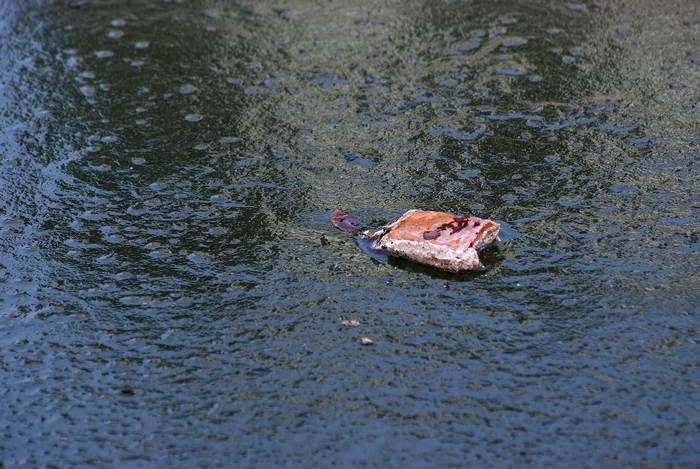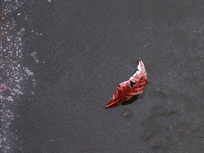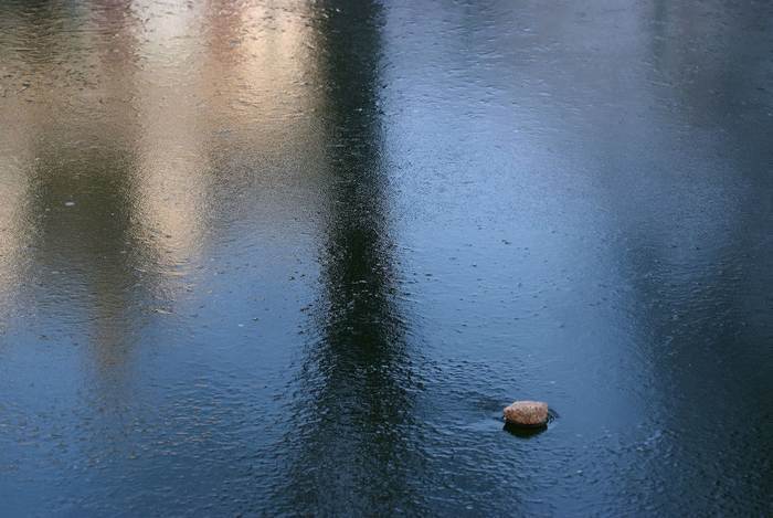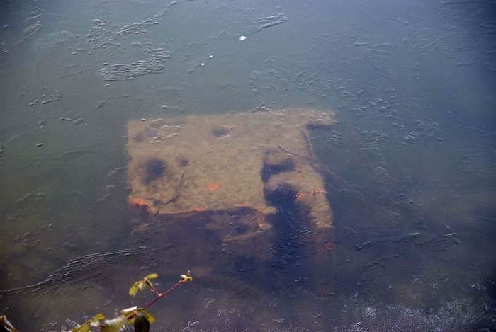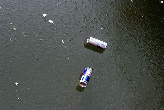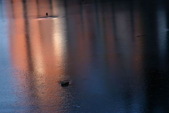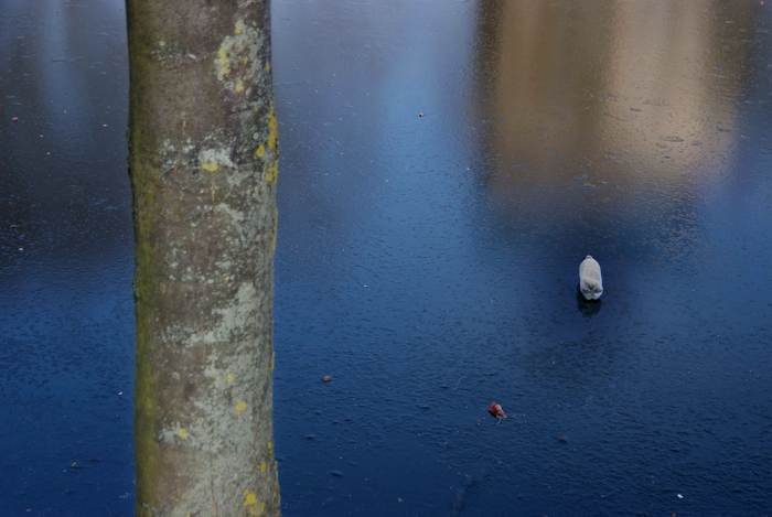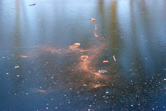 Sur le canal glacé du Rhône au Rhin, Quai de l’Alma à Mulhouse en plein hiver 2010. Quelques débris jetés par des festoyeurs avinés. Ces débordements sont bien visibles dans ce cas.